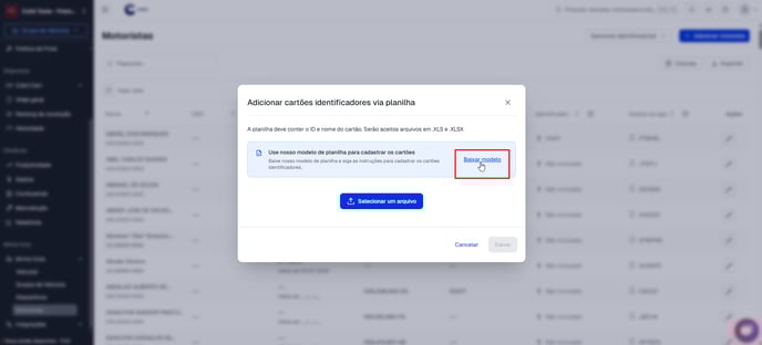 Na janela de Importar cartões RFID clique em Selecionar um arquivo para baixar a planilha usada para cadastro de cartões RFIDs