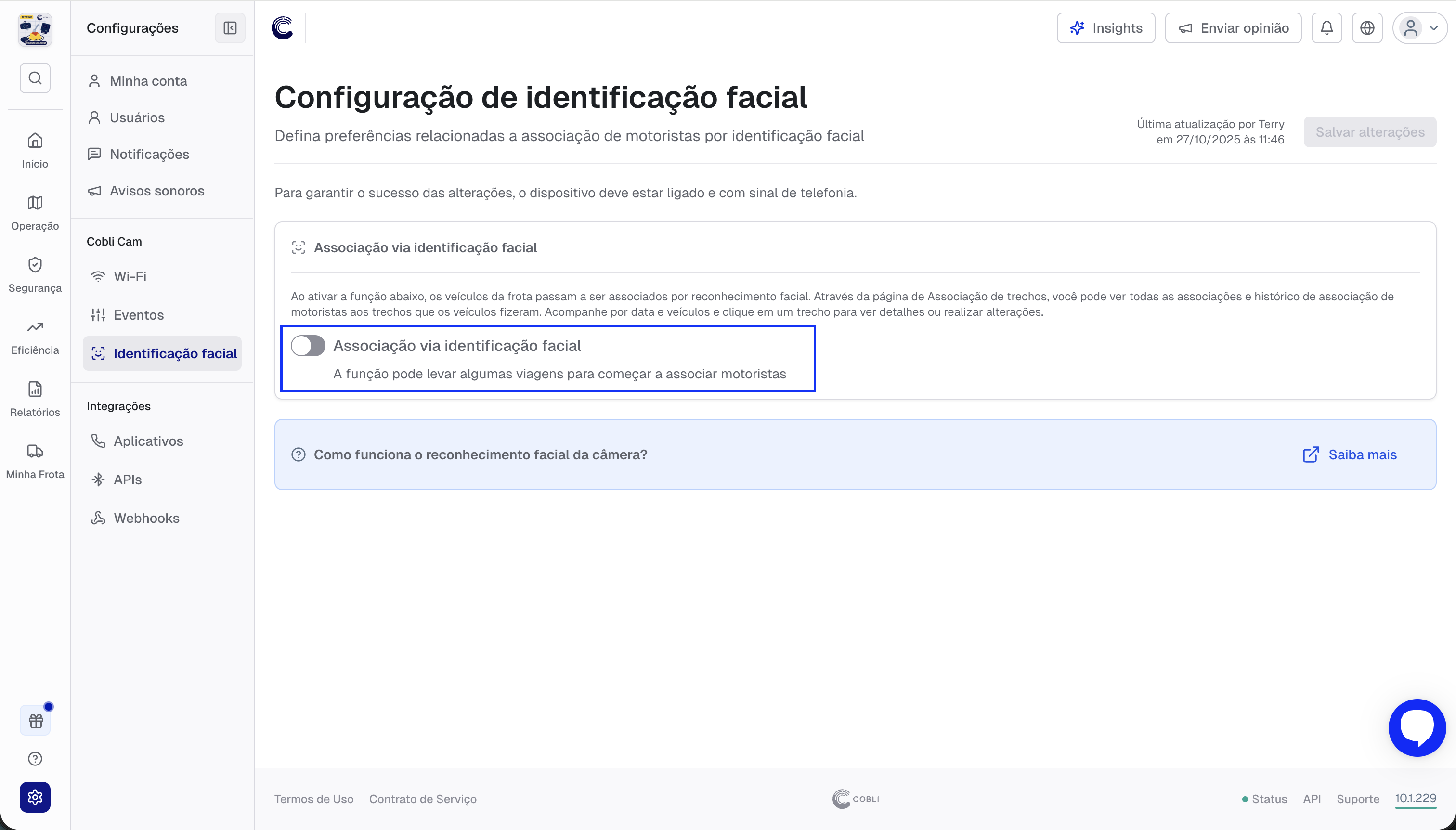 A CobliCam pode ser habilitada para atribuir automaticamente motoristas a veículos em viagens usando imagens da câmera. Hoje, a nossa funcionalidade de reconhecimento facial é feita através de imagens dos motoristas que são capturadas pela câmera e/ou anexadas aos seus cadastros direto no painel, com a devida associação do motorista ao conjunto de fotos, nossa inteligência artificial pode nomear e diferenciar motoristas nos trechos de viagens realizadas.