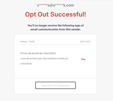 - Uma página de confirmação será exibida em inglês com a mensagem "Opt Out Successful!", confirmando que o descadastro foi realizado com sucesso.