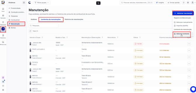 Acesse Eficiência > Manutenção > Lembretes de Manutenção > Adicionar manutenção e clique em Adicionar lembrete