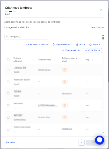 Na próxima etapa o cliente deverá escolher para quais veículos ele vai configurar essa manutenção. Todos os veículos selecionados terão as mesmas informações configuradas na primeira etapa (mesmo título, mesma observação e mesmo intervalo)