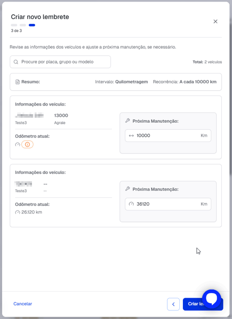 Após selecionar os veículos que terão àquela recorrência de manutenção, o responsável poderá olhar o resumo do lembrete e definir qual será a quilometragem, odômetro ou data da próxima manutenção.