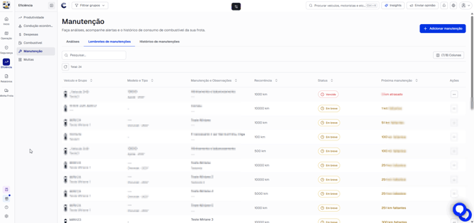 Dentro de Eficiência > Manutenção > Lembretes de Manutenção , todos os lembretes e recorrências de manutenção já criados para aquela frota estarão listados na tabela.