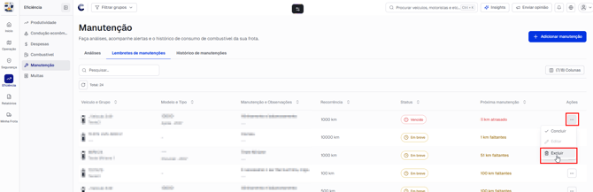 Para excluir um lembrete de manutenção, basta clicar nas ações daquele lembrete em Eficiência > Manutenção > Lembretes de Manutenção e clicar em excluir.