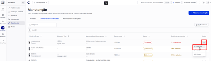 Para Concluir um lembrete basta clicar nas ações daquele lembrete em Eficiência > Manutenção > Lembretes de Manutenção e clicar em Concluir.