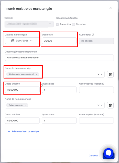 Ao clicar em Concluir, o usuário deverá preencher as informações da manutenção realizada no veículo: