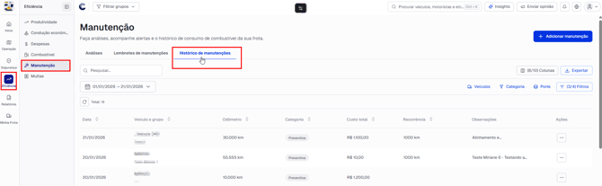 Para acessar a aba de Histórico de Manutenção vá em Eficiência > Manutenção > Histórico de manutenção.