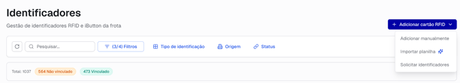 Na página de identificadores, clique no botão "Adicionar identificador" para iniciar o cadastro de um novo cartão RFID. Você pode adicionar um por um ou via planilha.