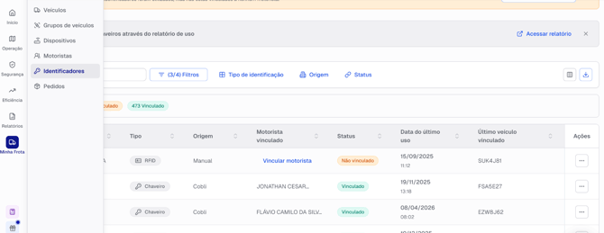 A Página de Identificadores é a nova área dentro de Minha Frota → Identificadores que centraliza o gerenciamento de todos os tipos de identificadores de condutor cadastrados na frota.